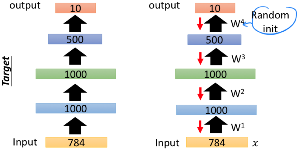 在以前如果随机初始化参数直接训练这样的网络往往会很难收敛。于是,我们可以先设计一个如上图右半部分所示的 Auto-encoder,将其自监督训练至收敛,保留 (784 -> 1000) 的参数 $W^1$。此时我们认为 $W^1$ 起到了 encoder 的作用:将 Input 的特征信息抽取到了 1000 个维度上。